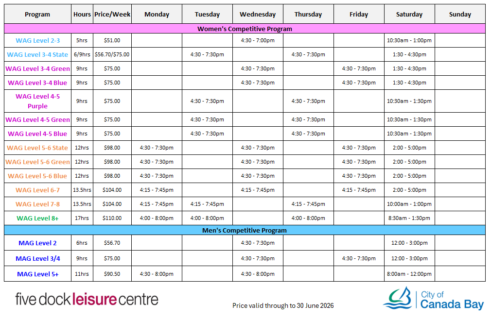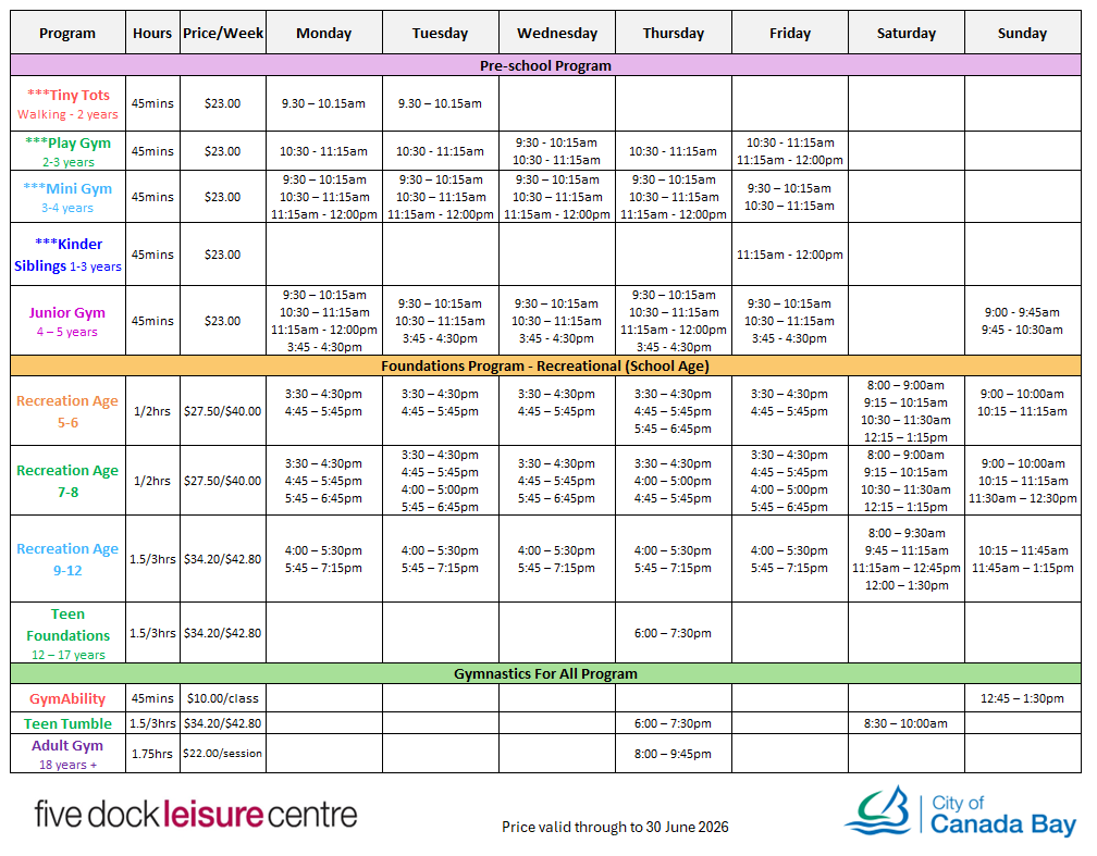 Breadcrumb Home Gymnastics Timetable Timetable Find out what gymnastics programs are running this year. Recreational Gymnastic Timetable 2026 Selective Gymnastics Timetable 2026 Competitive Gymnastics Timetable 2026