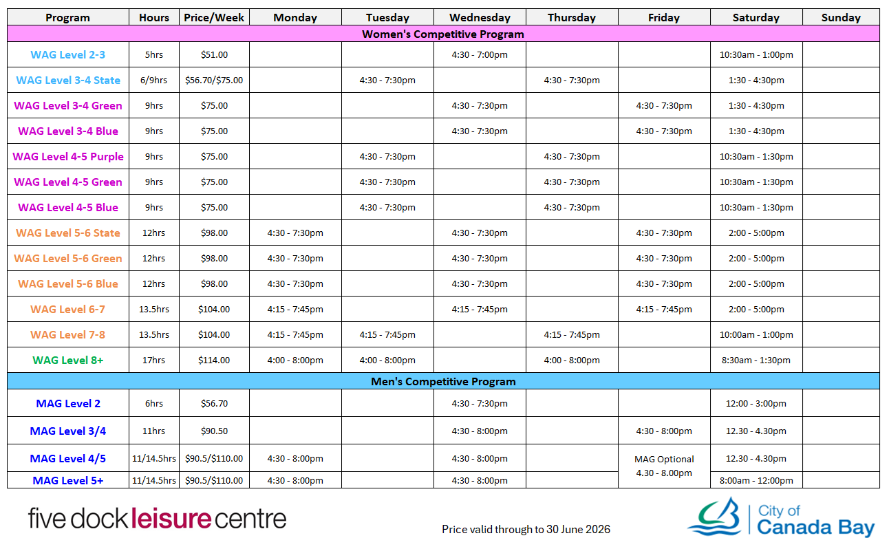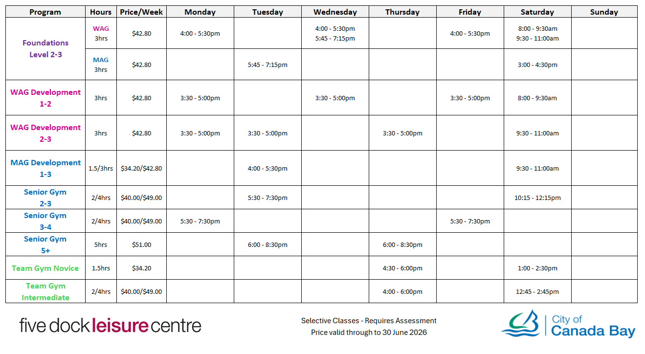 Breadcrumb Home Gymnastics Timetable Timetable Find out what gymnastics programs are running this year. Recreational Gymnastic Timetable 2026 Selective Gymnastics Timetable 2026 Competitive Gymnastics Timetable 2026